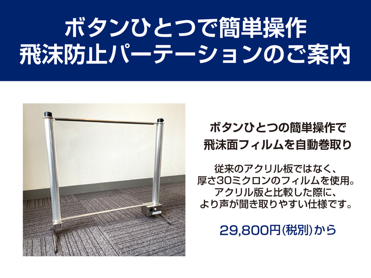 2022/04/05オートシールド販売開始2022年4月5日読了時間: 1分掃除がいらない飛沫防止パーテーション『AutoShield』をご紹介します。これまでになかった新しいコンセプトの基にwithコロナの時代を見据え開発された製品。従来のアクリル版をフィルム素材に置き換えたパーテーション。自動で巻き取り、手間要らずで衛生的。フィルムなので薄く、声がこもらず会話がスムーズ。様々なシーンでのご利用が可能です。ぜひこの機会に『AutoShield』をご検討ください。お問い合わせはこちら